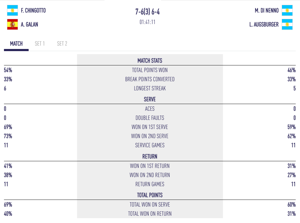 第二盘比赛开始时…… 惊恐的瞬间 :在夺回球权后, 利奥·奥格斯伯格膝盖受伤他在地上躺了几分钟,直到理疗师介入才得以恢复。比赛似乎受到了影响,但这位阿根廷球员最终还是重返赛场,只是明显受到了伤病的困扰。这一意外暂时打乱了加兰和钦戈托的节奏,导致他们一度落后。但领头羊很快重新掌控了比赛:奥格斯堡受到伤病影响,出现了多次非受迫性失误,让对手抓住了机会。 加兰和钦格托 彻底逃脱,结束于 7/6 6/4。