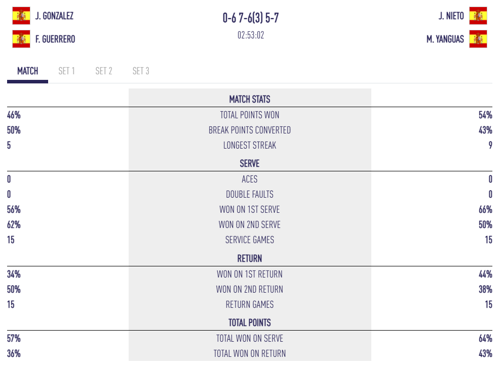 第一组数据非常高 比赛水平双方都发挥出色,没有出现任何破发点。比赛强度达到了最高点,尤其是在网前对攻中。 加兰行事专横跋扈。凭借多次制胜截击,西班牙-阿根廷组合最终赢得了抢七局,他们在关键时刻表现得更加沉着冷静。
